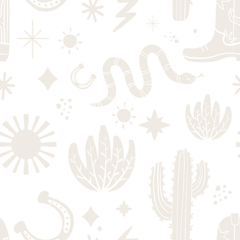 Welcome to the wild west with our Dolly wallpaper, a fun and enchanting design that captures the essence of Texas and the American west. Adorned with illustrations of cacti, sparkling stars, and lucky horseshoes in a soft cream hue, this wallpaper is set against a muted sage background for a subtle and elegant take on cowboy style. The addition of snakes and cowboy boots emphasizes the wild and free spirit of rodeo culture and the vast desert landscapes of the west. Bring a touch of rustic charm and a sense of adventure to your space with this unique and captivating wallpaper design.