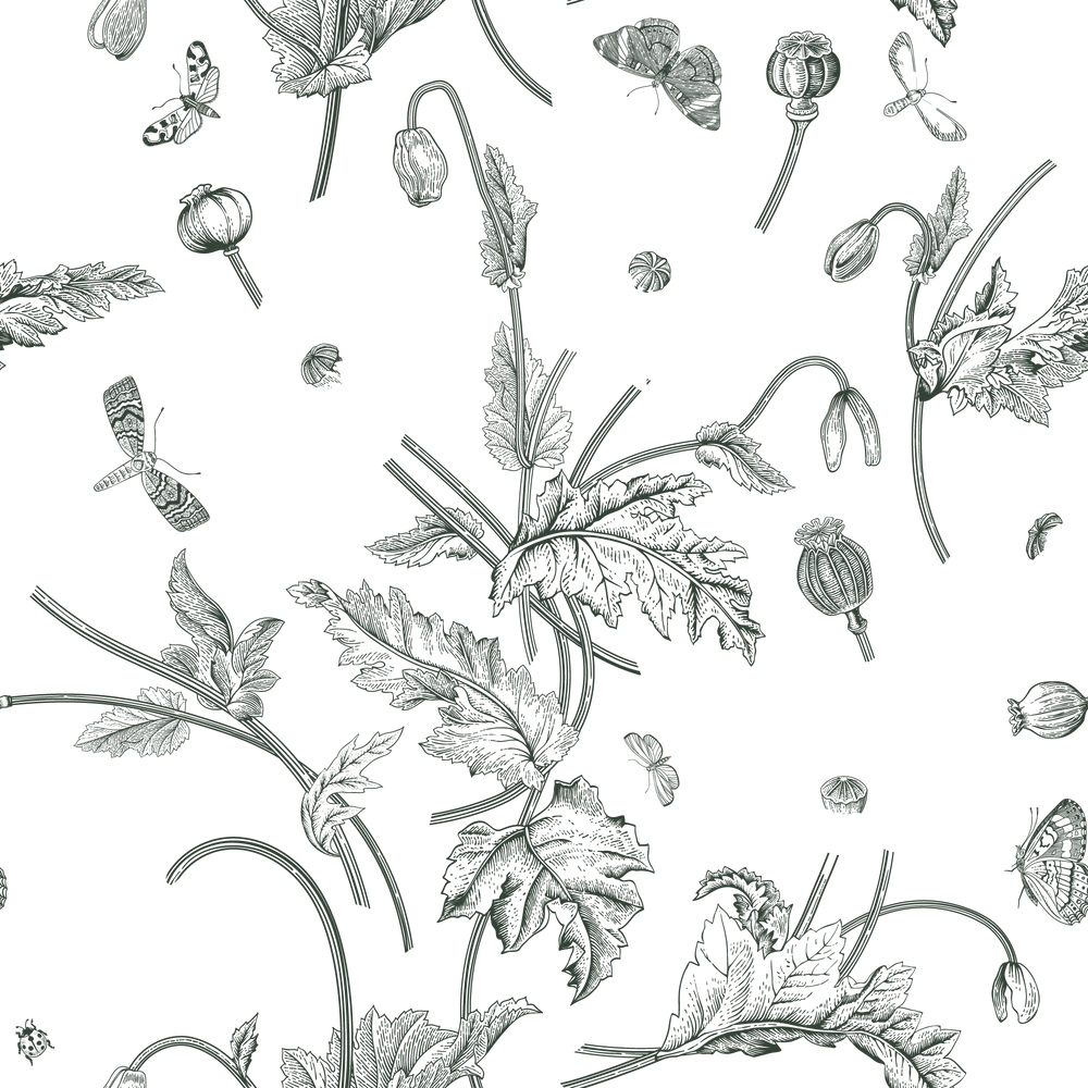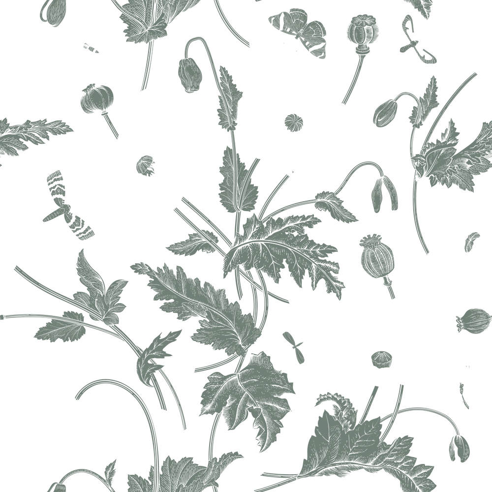 Immerse your space in timeless elegance with Natalia. Delicate Victorian-inspired illustrations featuring pristine white poppies, graceful green and white butterflies, and verdant leaves on a soothing pale sage green background. Elevate your decor with this botanical masterpiece.